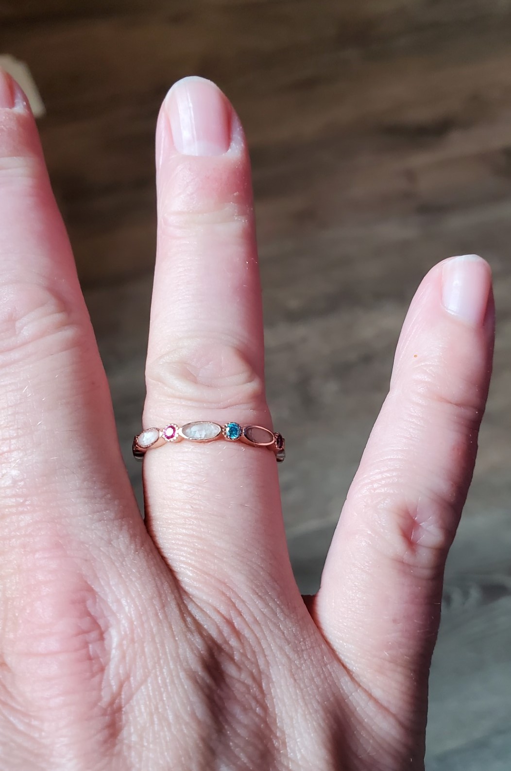 The ring comes with clear zircons but you have the option to change the zircons for birthstones.