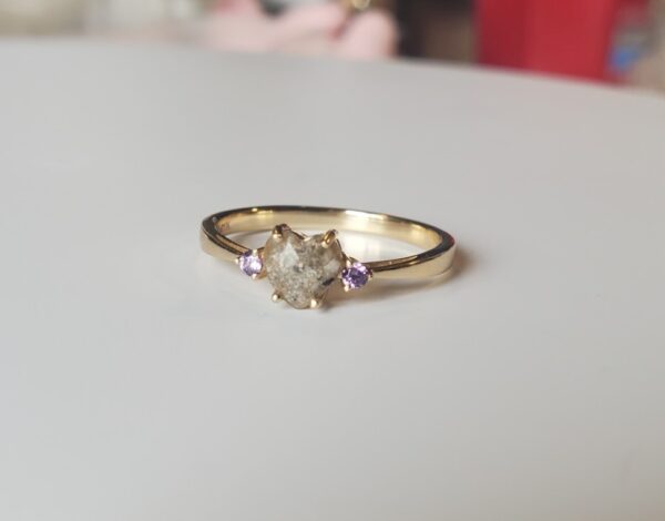 Taille de l’anneau (U.S.): Cette bague est disponible dans toutes les tailles ainsi que les demis et quarts de points, veuillez m’indiquer en commentaire la taille désirée si elle ne se retrouve pas dans les options.